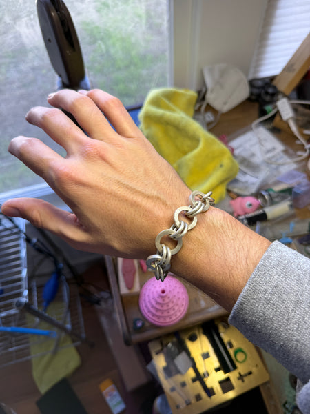 Measures 9” (The links are very thick so it needs to be longer than typical. I usually wear a 7.25” bracelet and this fits me perfectly)